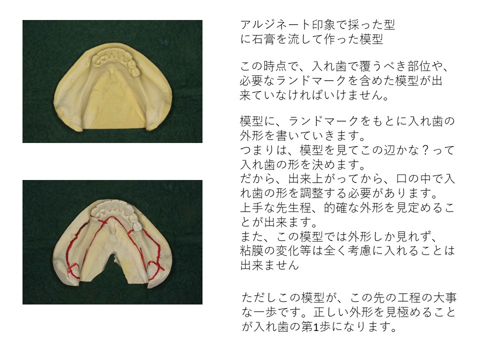 - 入れ歯の形は「模型を見て、だいたいこの辺かな?」と歯医者あるいは技工士が決める