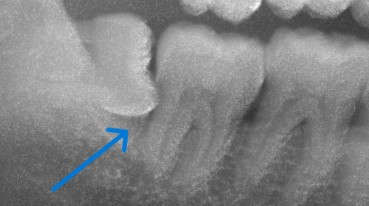 レントゲンでは、親知らずが手前の歯の根元にぶつかり、
